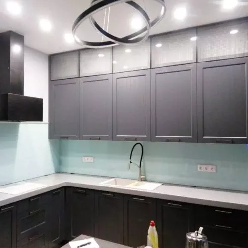 - Сочетается со всеми современными направлениями в дизайне. Серая панель с приятным блеском отлично дополняет дорогую бытовую технику, столешницу из натурального камня.